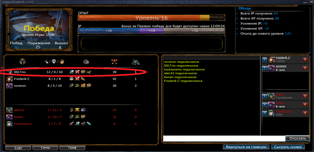 | League of Legends - игра,попав в которую ты оказываешься в мире доты. В ней есть - Огромное количество персонажей - Отличная графика - Все персонажи сбалансированы - Каждая неделя - неделя 10-ти персонажей - Хороший ландшафт - Игра почти полностью переведена на русский язык - И многое другое узнать сможете сами в игре Для тех кто заинтересован вот ссылка http://lol-game.ru/ru-lol/ Я могу помочь вам начать,посоветовать какого героя выбрать,играть вместе с вами и многое другое В игре или в скайпе я могу рассказать о игре побольше,выложить скрины из моих игр Всем советую Мой скайп xxl-trio Добавлено (20.05.2011, 00:18) --------------------------------------------- Макс еще сделай что бы в прикреплениях можно было выкладывать фото формата PNG и другие